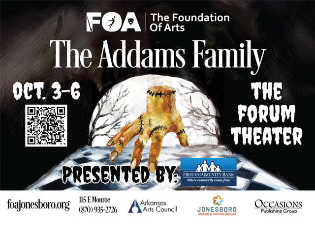 The Foundation of Arts will present “The Addams Family” musical at The Forum Theatre in Downtown Jonesboro. Showtimes are Oct. 3 at 7 p.m.; Oct. 4 at 7 p.m.; Oct. 5 at 2 p.m.; and Oct. 6 at 7 p.m. Tickets are available online or at The Forum Box Office. Info: (870) 935-2726 or visit FOAJonesboro.org.