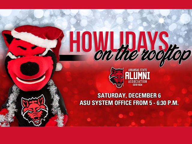 A-State Alumni Association will host Howlidays on the Rooftop from 5-6:30 p.m. at the ASU System Office on Woodlane Street in Little Rock. Alumni are invited to enjoy refreshments and a holiday lighting ceremony at the Arkansas State Capitol. Info: (870) 972-2586 or visit astatealumni.org.
