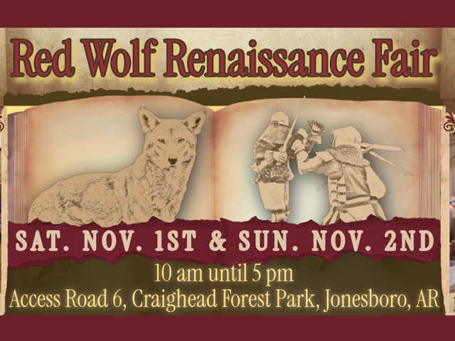 The Red Wolf Renaissance Fair will take place from 10 a.m. to 5 p.m. Saturday and Sunday at Craighead Forest Park in Jonesboro. The fair combines medieval reenactments, live jousting, artisan crafts and family-friendly performances with educational exhibits about Red Wolf Conservation. Proceeds support wildlife education and local conservation efforts. For more information, visit redwolfrenfair.org or the event’s Facebook page.